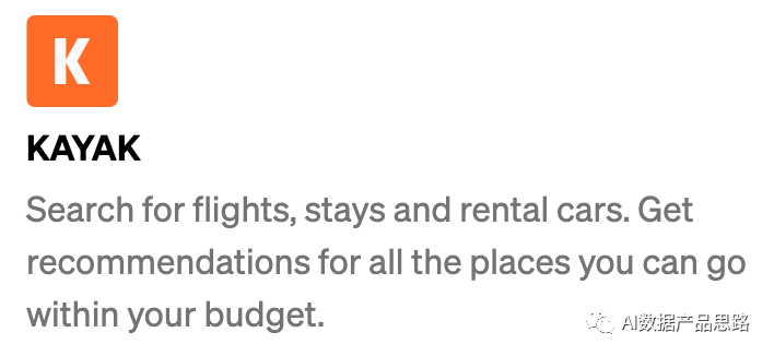 这个插件是一个与旅行搜索引擎交互的工具,旨在帮助用户搜索航班、住宿、租车以及探索符合预算的旅行目的地。它整合了 KAYAK,一个在线旅行搜索引擎,提供航班、酒店、租车和度假套餐的搜索和预订服务。