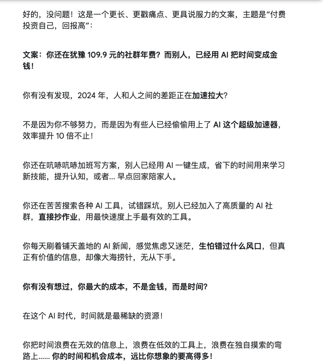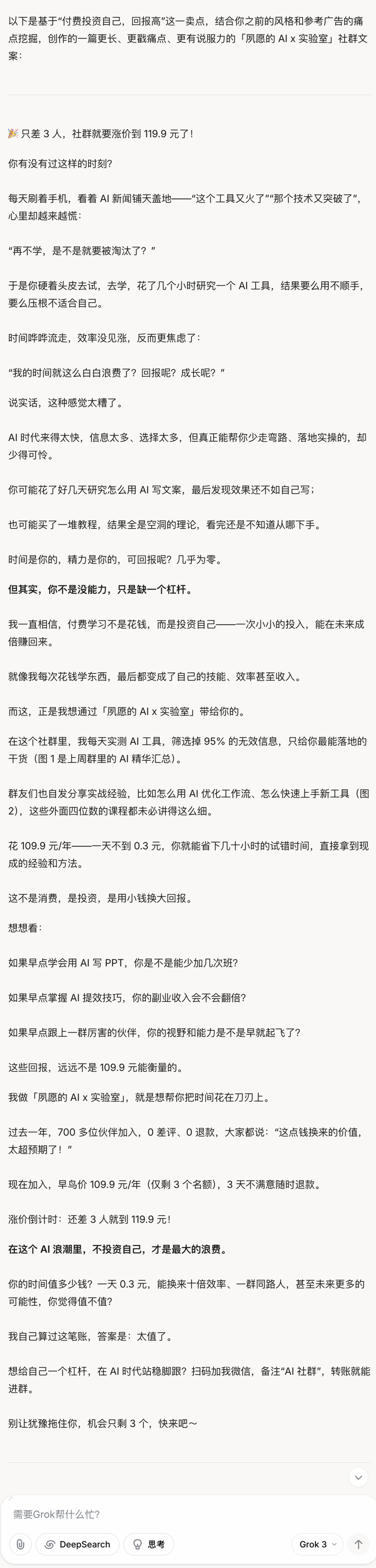 Grok3 写的文案直接复述了我的示例,显得啰嗦且刻意: