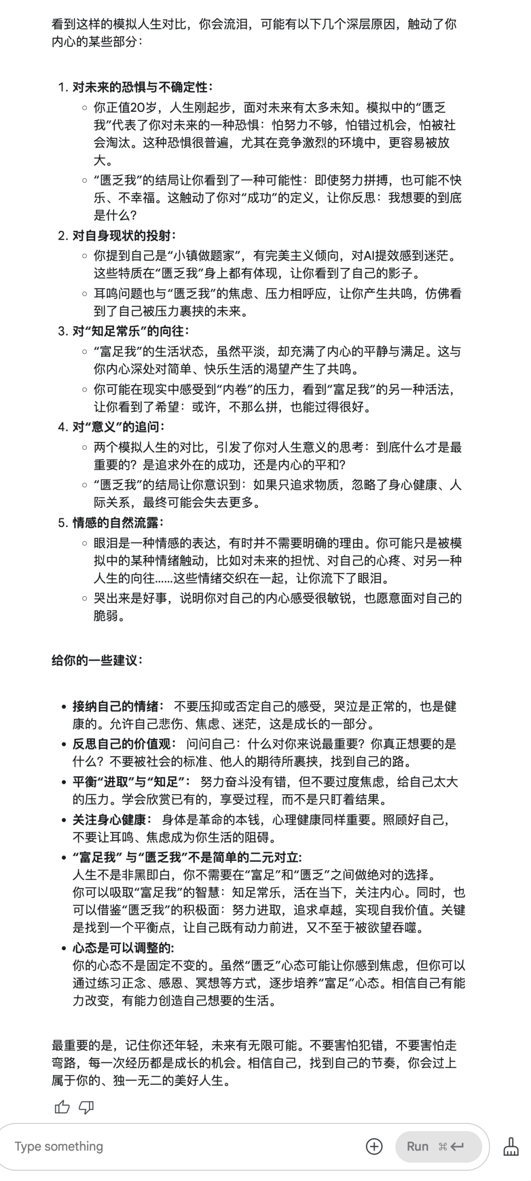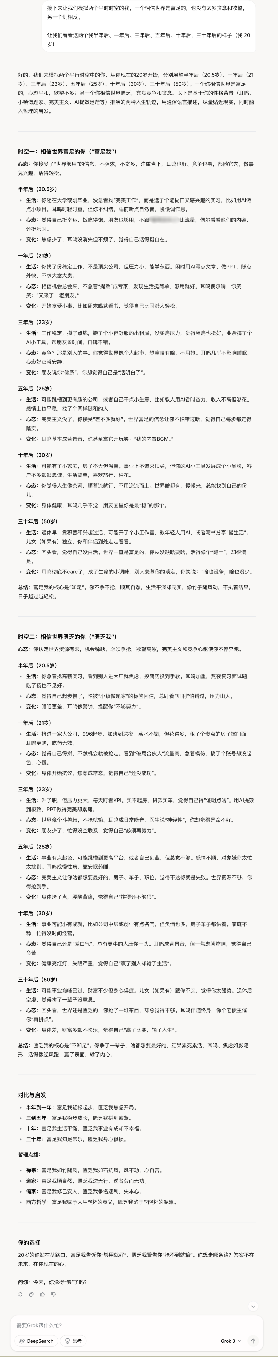 我让 AI 模拟两个平行世界的自己,一个相信世界是富足的,另一个则充满了焦虑和欲望。