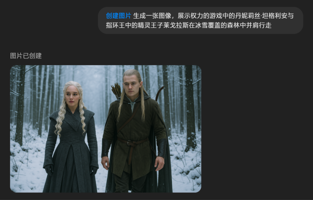 ① 文字生图 简单粗暴,输入描述直接出图: "生成《权游》龙妈和《指环王》精灵王子在雪林中并肩行走的画面"
