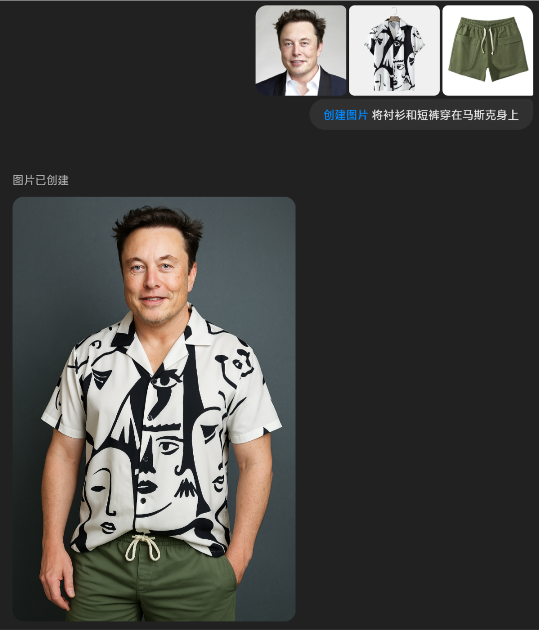 更绝的是可以多图融合: "把这两件衣服穿在马斯克身上"
