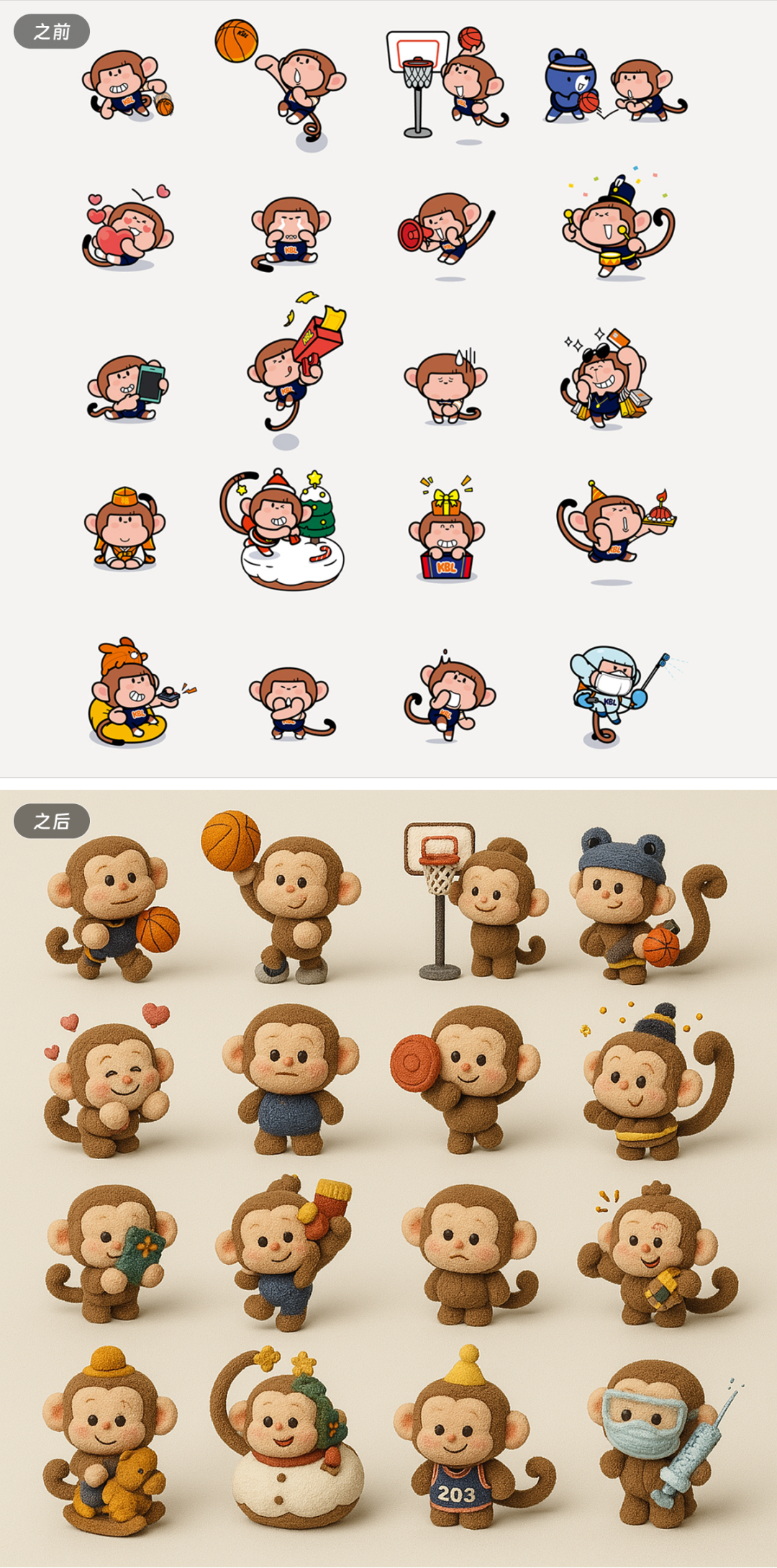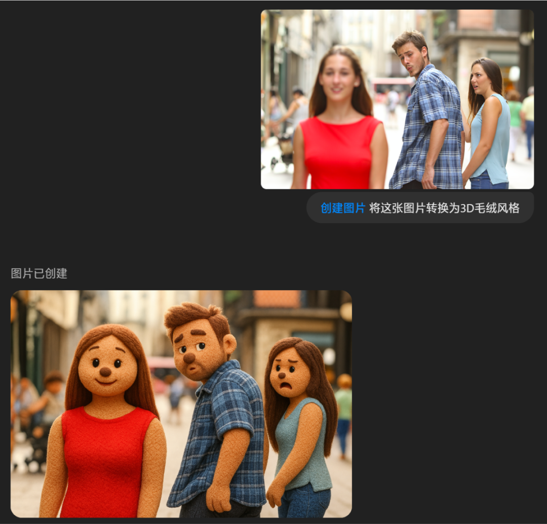 ② 图片+文字生图 上传图片后提要求: "把这张真人照片转成3D毛绒风格"