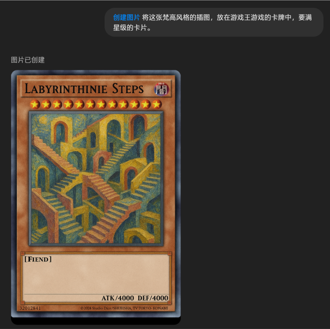 ② 多轮对话大师 像跟设计师朋友聊天一样,可以不断提要求修改细节:"把梵高风格的画做成游戏王卡牌!"它真的懂!