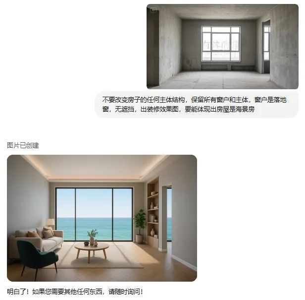 这个就厉害了!一句简单的指令包含了主体不变、落地窗、海景房等多个要求,4o全都完美get: