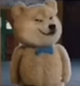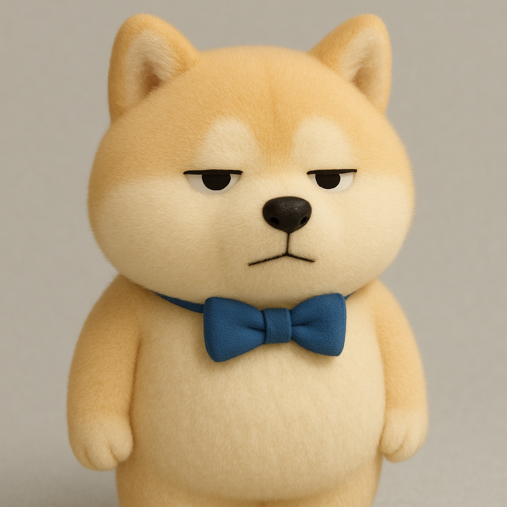 创建图片:一个戴着深蓝色蝴蝶结领结的柴犬,表情参考我上传的图片,3D风格,毛绒绒质感,不要太逼真,比例为1:1