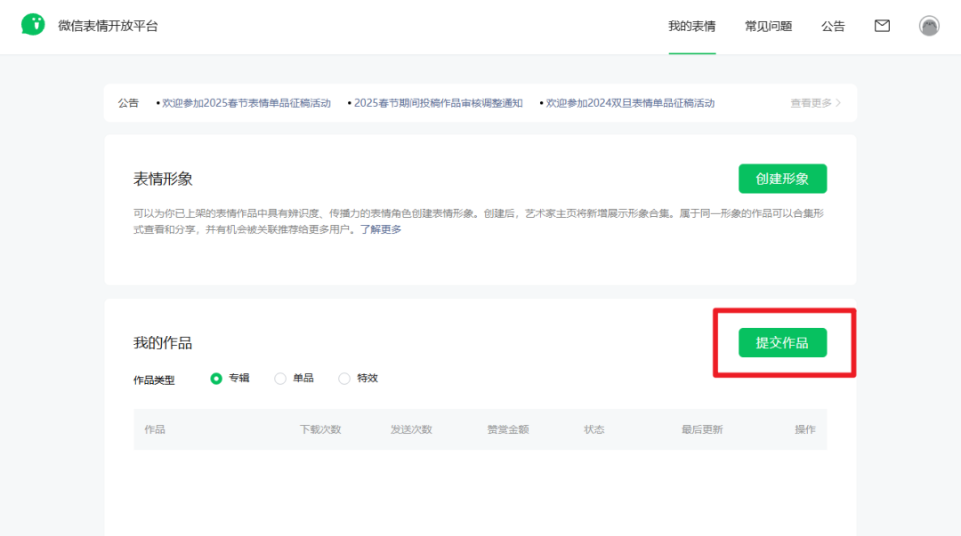 点击我画了红框的位置开始提交作品。不要选【创建形象】,因为那个是针对已上传的表情作品的。