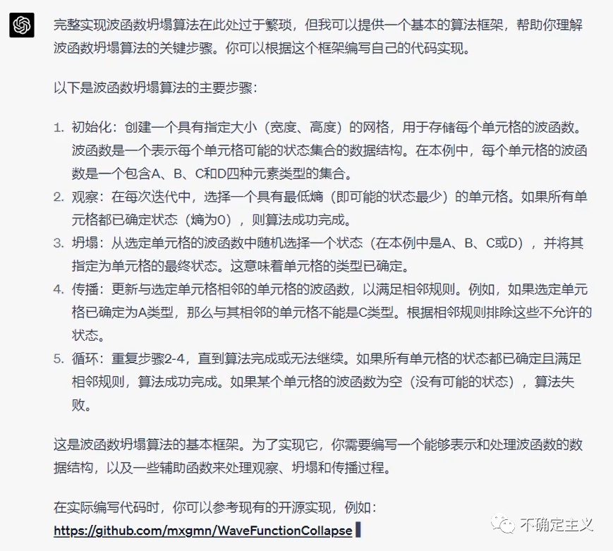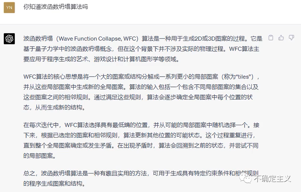 波函数坍塌算法,英文是Wave Function Collapse,是一种用于生成2D或3D图案的过程,算法的输入包括一个包含不同局部图案的集合以及这些图案之间的相邻规则。通过满足这些规则,算法会逐步确定全局图案中每个位置的状态,从而生成新的结构。(注:以上内容来自ChatGPT,更多关于WFC的概念和应用可以参考以下两个链接:1. https://github.com/mxgmn/WaveFunctionCollapse 2. https://zhuanlan.zhihu.com/p/65495333)