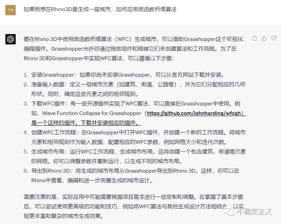 接下来进入正题,如何在我们常用的建模软件Rhino3D里使用这个算法。一开始GPT比较偷懒的告诉我去下载一款WFC插件直接使用(BTW:这款插件我确实下载了,功能很全面,包含运算器也挺多,如果有兴趣大家可以自行尝试一下)当然我的目的不是直接用插件,而是自己写一个插件出来,这样自己如果想要定制化的修改就更方便一些。