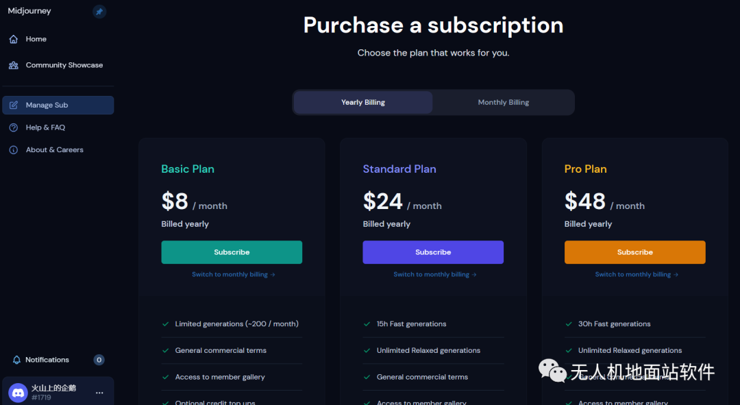而Bing AI 绘画相对不错,因为Midjourney 已经没有免费次数了,最低8美元一个月起步,对于仅仅想了解AI画图的来说,Bing AI 是一个很好的入口,Midjourney 收费界面: