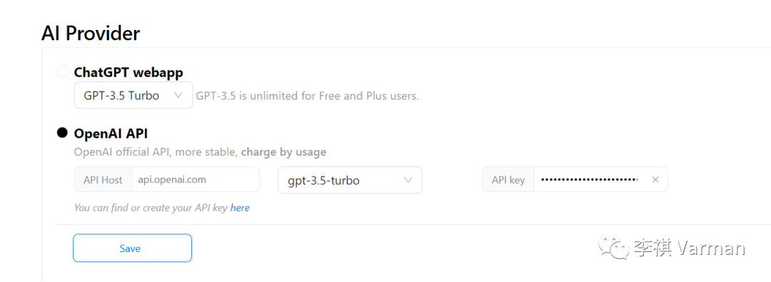 点击 Glarity Summary 旁边的齿轮进入设置页面,然后找到 AI Provider 选择OpenAI API ,然后将自己的 OpenAI API 粘贴过去。