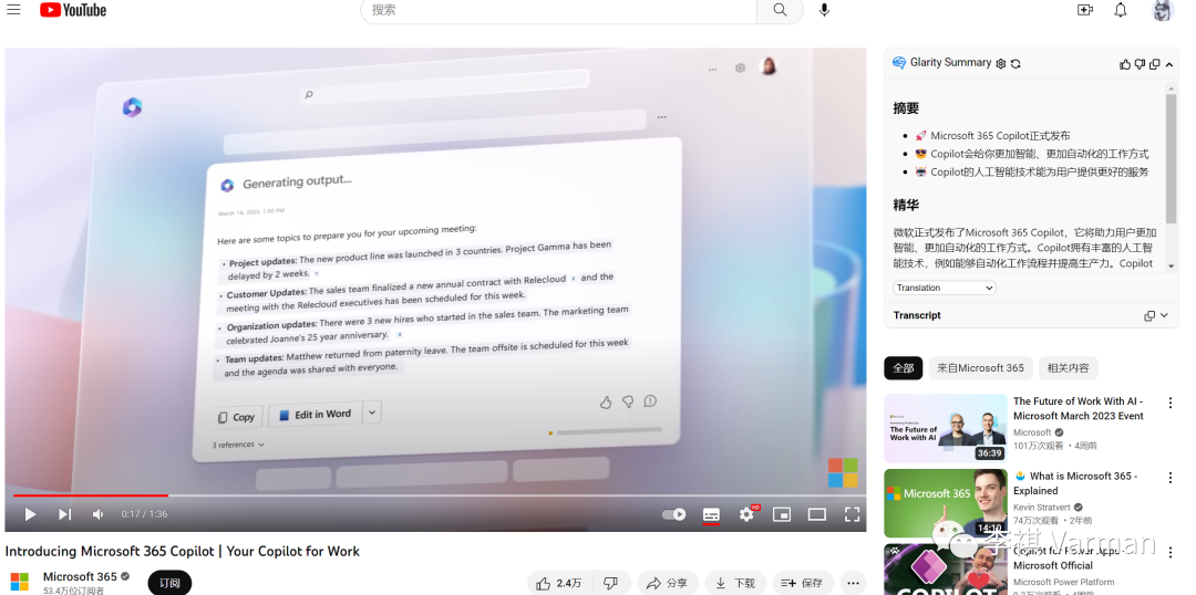 比如看 YouTube 视频的时候,在旁边也能展示 ChatGPT 摘要,来快速总结出视频的摘要和精华部分。