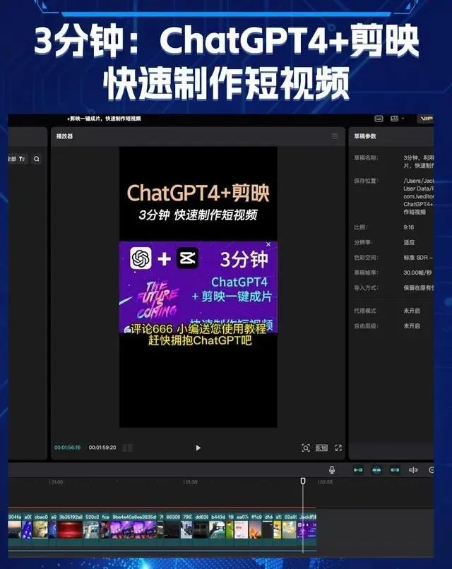 当然3分钟做出来的短视频还达不到成为爆款短视频的条件;而且要做一个精美的短视频,是远远是不止3分钟的,但是学会使用ChatGPT4和剪映后,可以大大缩短你做短视频的工作量,提高至少50%以上的效率,有了这些工具,能使我们的工作事半功倍;AI时代,效率就是金钱,越早拥抱GPT,就先一步领跑同行了,犹豫什么呢,赶快拥抱GPT吧,Let's Go GPT!