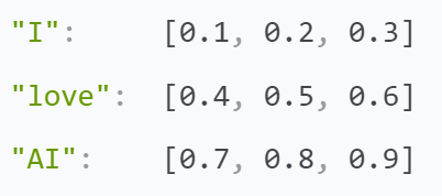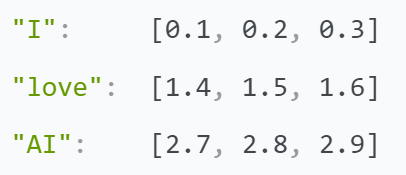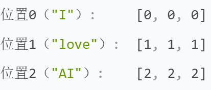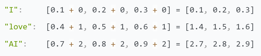 假设我们有一个句子 "I love AI",我们先将每个单词转换为词嵌入向量,然后加上位置编码。我们使用的是简化的模型,词嵌入向量和位置编码向量的维度都是3,而不是Transformer中通常的512。