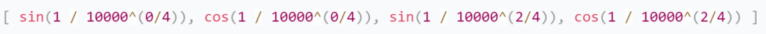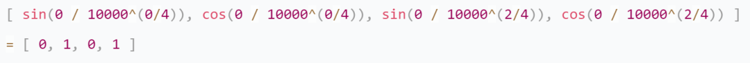 例如,如果我们的词嵌入向量的维度是4,那么对于位置0(即序列中的第一个词),位置编码向量可能看起来像这样: