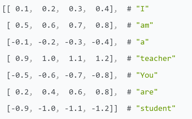 当我们想要获取一个词的词嵌入时,我们只需要查找这个词在词嵌入矩阵中对应的行。比如,如果我们想要获取 "teacher" 的词嵌入,我们可以查找词嵌入矩阵中的第4行(索引从0开始):