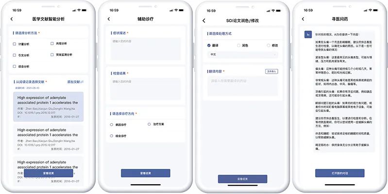 ChatGPT+Info X Med,医生助手+科研助手,打通底层AI与自研数据库交互逻辑;建立交互关系,覆盖医生科研多场景应用;拓展多样化技术处理方式,如文件处理、文档解析、图表识别等方面。解决日常需求,提高效率。
