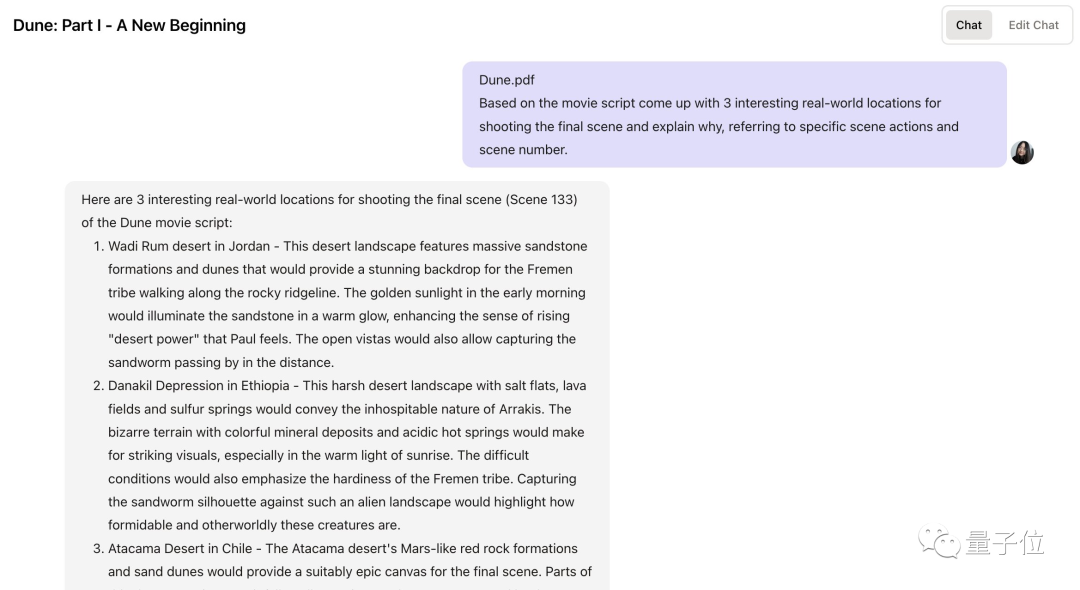 除此之外,还能帮导演处理剧本选址一类的问题。如给出《沙丘》的电影脚本,问Claude最适合拍摄的地点,它很快就能给出几个对应的参考地址: