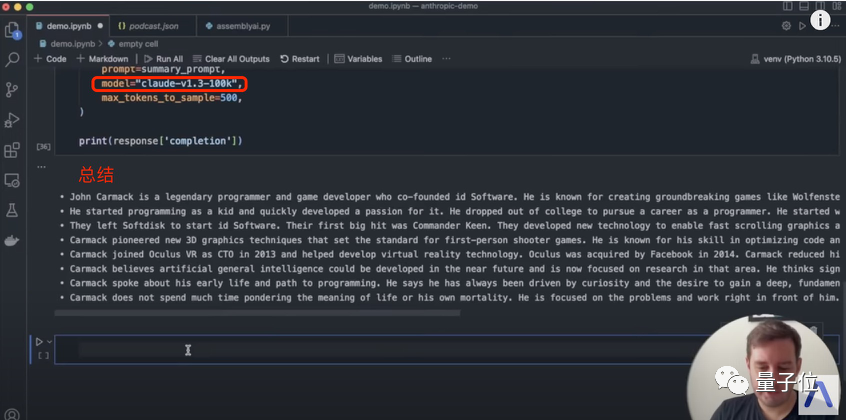 在视频演示中,他用Claude-100k总结了一下Lex Friedman的5小时长播客(内容与John Carmack有关),效果看起来也非常不错: