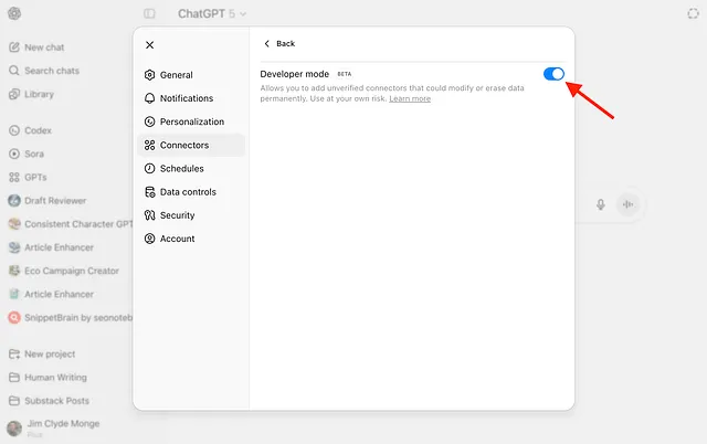 开启方式:进入 Settings → Connectors → Advanced → Developer mode。
