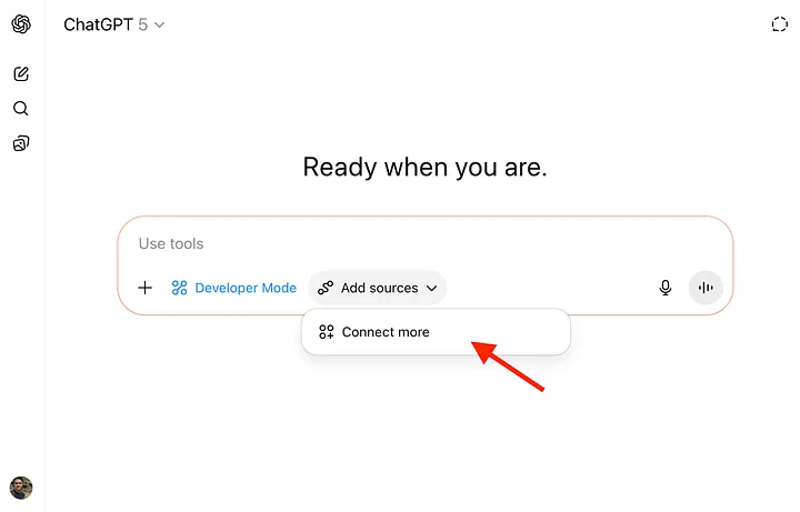 - 打开 ChatGPT,对话框左侧点击 “+”,在 More 菜单中选择 Developer Mode。