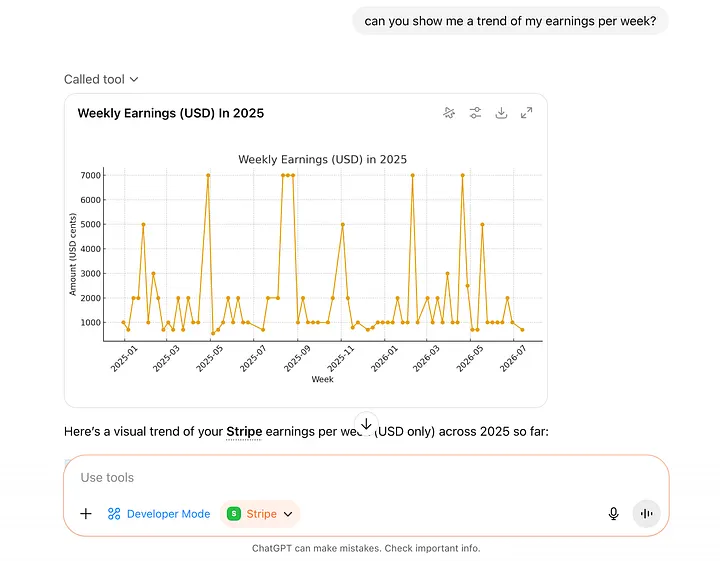 返回结果与 Stripe 后台核对一致。 接着可以让它生成周维度收入趋势: