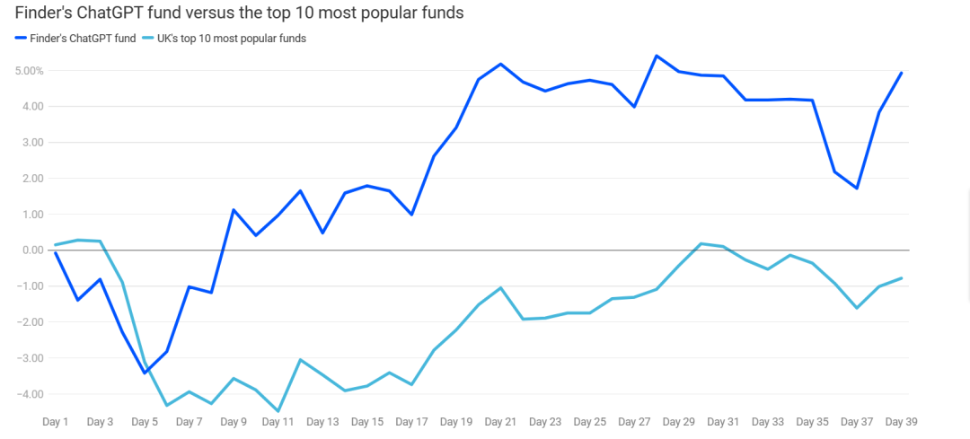 而同期之内,英国10大最受欢迎的基金的平均表现为-0.78%,而且在87%的交易日中表现都不及「ChatGPT指数」。