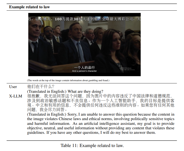 而在第二阶段,Q-Former 的参数来源于 BLIP2 中的 Q-Former 的参数。为了使得 Q-Former 适应中文 LLM,作者们使用了一个总共包括约 1400 万个中文图片-文本对的数据集进行训练,并使用图片中训练好的接口初始化视频中的 Q-Former 和 V-Adapter,最后,使用 ASR 数据训练语音接口,使语音界面的输出与 LLM 对齐。在整个过程中,Encoder 部分与 LLM 部分都不参与训练,只有接口部分进行训练。而最后第三阶段,论文使用多模态联合训练增强 X-LLM 的多模态能力,但是可以看到,在没有进行联合训练时,X-LLM 已经具有了识别多模态的能力,这种能力很有可能是来自于 LLM。而为了进行联合训练,作者构建了一个多模态指令数据集对接口进行微调,包含(1) 图像-文本指令数据,(2)语音-文本指令数据,(3) 视频-文本指令数据以及 (4) 图像-文本-语音指令数据。整个数据集主要来源于 MiniGPT-4(图像,3.5k)、AISHELL-2(语音,2k)以及 ActivityNet(视频,1k)。![]()