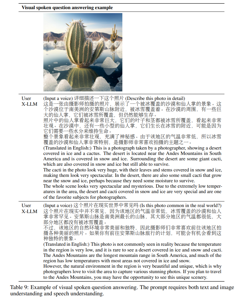 同时,X-LLM 也能准确的识别和理解语音信息,这里的“详细描述一下这个“照片”是以语音形式进行的输入,可以看到 X-LLM 也能给出相当不错的回答,并且可以进行延申交流。![]()