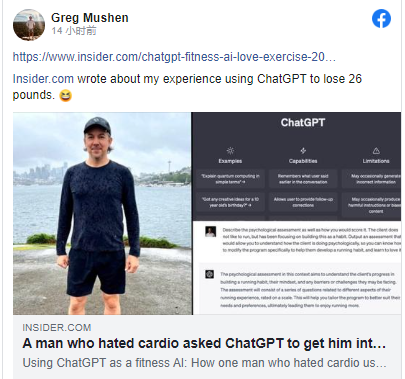身为一名每天花大量时间编码的技术工作者,穆森对ChatGPT非常熟悉,但他认为,每个人都可以用ChatGPT当教练,最大的益处是提升运动的动力,且省时间又省钱,不过机器人提供的资讯仍需要查证,因此不太可能取代私人教练。ChatGPT为穆森设计的计划可行性高且风险低,却简单到看起来完全不会产生效果,例如不建议在3天内认真跑步,而是走人行道5分钟就好,起初令他有些困惑,但他还是决定照做,一步步完成计划,尽管每个阶段都很简单,完成时都能获得成就感。穆森过去倾向于较激烈的运动,却让他感到疼痛、疲惫,而ChatGPT的计划循序渐进,他现在每周跑步6次,包括4次45分钟到1小时的轻松慢跑,以改善健康和有氧能力,最近才增加更高强度的项目,但每次时间仅约半小时。因为任务比想像中容易、步调缓慢,穆森不至于精疲力尽,反而获得继续坚持的动力,想做得更多、对未来的训练满心期待。他说明,AI也许无法取代私人教练,却能够节省自己看书研究或找教练的时间和金钱,"ChatGPT是个很好的折衷方案,因为是免费的。"