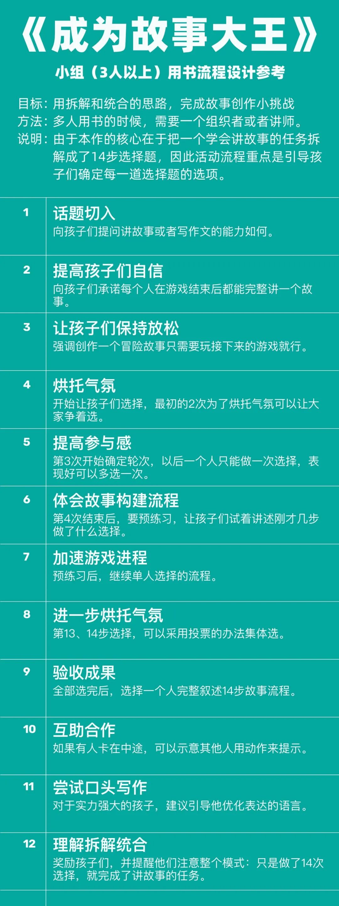 简单来说,这就是一个跟3个以上孩子分享《成为故事大王》的一个参考流程。我用它尝试给孩子们讲解“拆解和统合”的道理,效果极好。并且我还计划用它来设计给孩子们讲解ChatGPT。这个东西是目前为止,给小孩子讲ChatGPT原理最好的工具书了,形象,直观,参与性好。