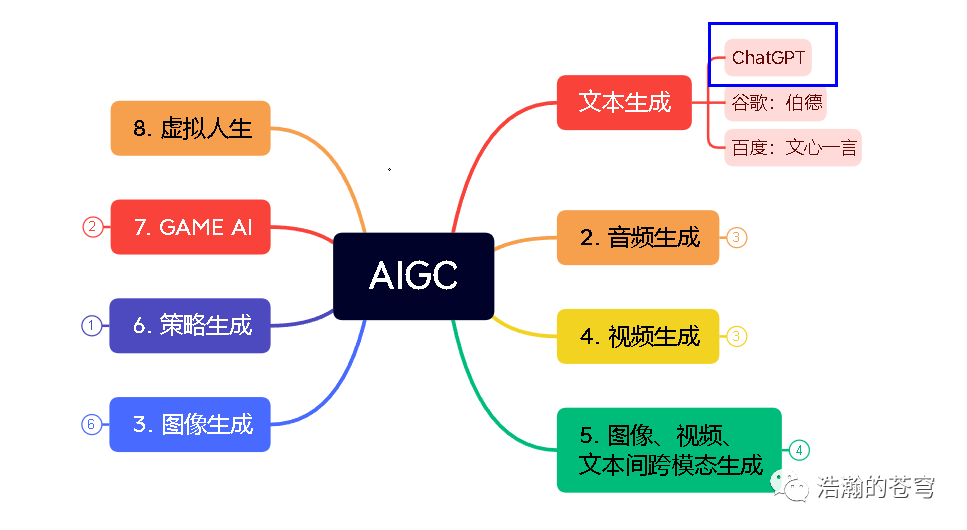 答:我给你一个我做的思维导图,列出了常见的细分领域中,排名数一数二的 AI 工具。如果 AI 工具是一个班级,ChatGPT 就是现任班长。