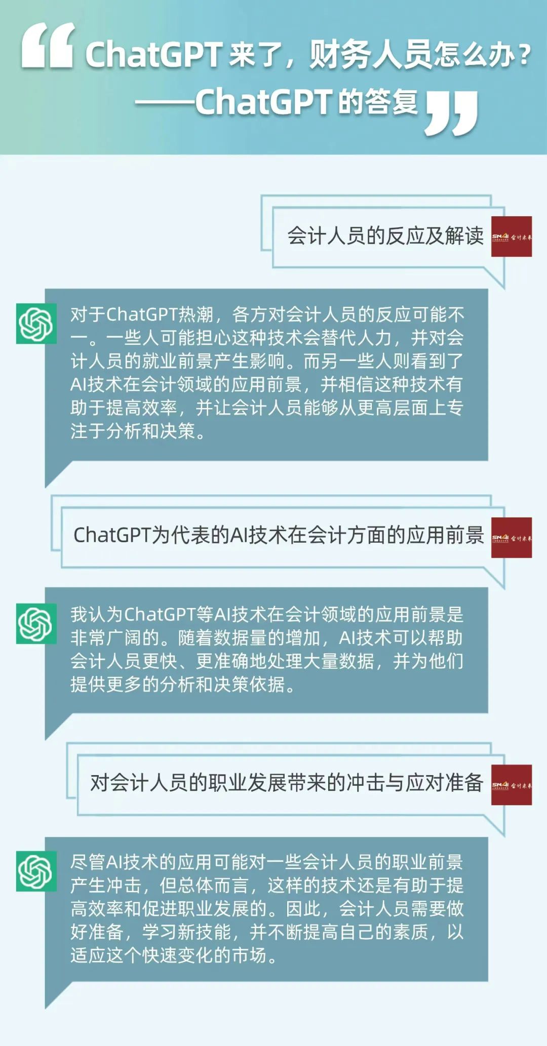 人类开发了ChatGPT,随着其进化发展,也将会重塑人类未来职业发展格局。会计人员现在需要积极接触ChatGPT,尝试学会和ChatGPT协作工作,学会提问和信息交互,其结果不仅在于提升工作效率,而是打造新型财务生态。因此我们不要总是想太多对个人的冲击,过多想我们自己会受到的影响,而是充满新鲜感和好奇感,想有了新技术我们能做什么,我们哪些东西可以做得更好,学会积极拥抱技术变化。随着技术的演变快速融入新的财务生态系统,随着财务工作效能的大幅提升,我们不自觉地就会找到自己的新位置。到那时可能会发现,我们其实已经离开了原来的位置。我们总是想着受到冲击其实更多的是认为自己还停留在原地,不要忽视我们自身的学习和进化速度与能力。因此不需要准备什么了,调整好心态,有条件的抓紧用起来比说什么都强。ChatGPT一定会取代一些人,但也一定会促进一大批人迈向新台阶。