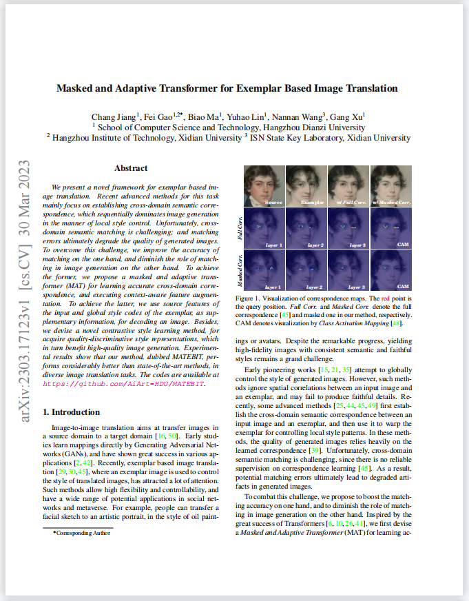 为了克服这一挑战,该论文提出了一种掩码和自适应变换器 (MAT),用于学习准确的跨域对应关系,并执行上下文感知特征增强。为了实现后者,使用样本的输入源特征和全局样式代码作为补充信息来解码图像。