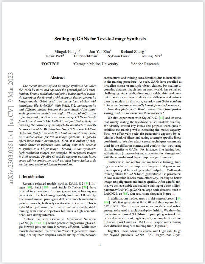 虽然在文生图领域,扩散模型似乎已经一统天下,但GAN 依然存在不可磨灭的优势。这使得一些研究者在这一方向上持续努力,并取得了非常实用的成果,相关的论文已被 CVPR 2023 接收。