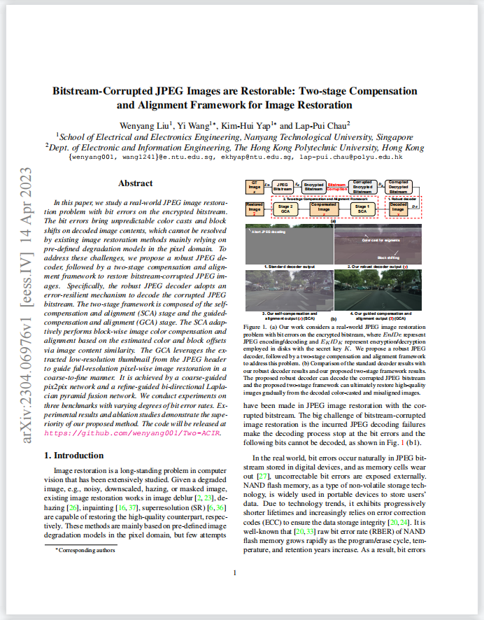 该论文研究JPEG图像恢复问题,即加密比特流中的比特错误。比特错误会导致解码后的图像内容出现不可预测的色偏和块位移,这些问题无法通过现有的主要依赖于像素域中预定义退化模型的图像恢复方法来解决。该论文提出了一个强健的JPEG解码器,并采用两阶段补偿和对齐框架来恢复受比特流损坏的JPEG图像。
