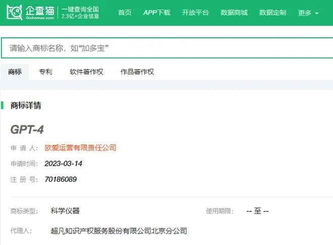 3 月 26 日消息,欧爱运营有限责任公司(OPENAI OPCO, LLC)近期申请注册了“GPT-4”商标,国际分类为科学仪器,当前该商标状态为申请中。此前,该公司还申请注册了一枚国际分类为网站服务的“WHISPER”商标,Whisper 为 OpenAI 此前发布的神经网络,声称其在英语语音识别方面已接近人类水平。