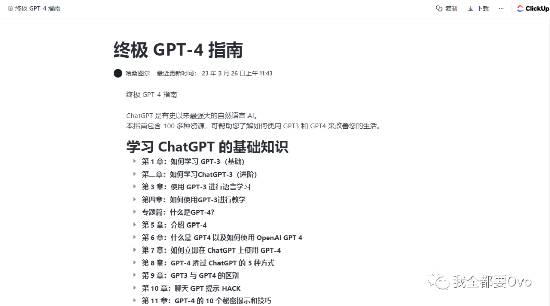 国外网友整理的"The Ultimate GPT-4 Guide"是一份终极 GPT-4 指南,该指南包含50多章节、100 多种资源,包括500多个AI人工智能工具、1000+个人工智能提示。它可以帮助用户了解如何使用GPT-3和GPT-4来改善生活。尽管该指南是英文的,但用户可以使用翻译软件来使用它。