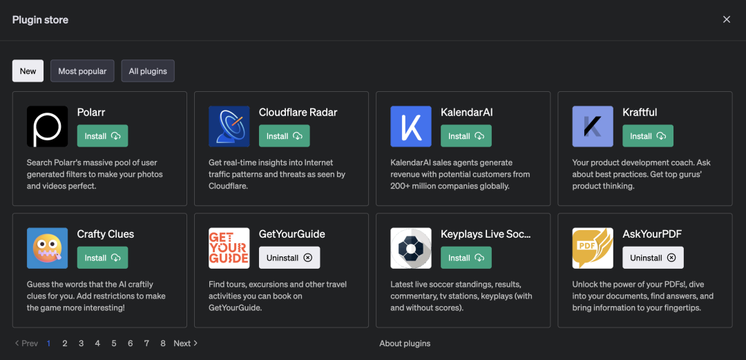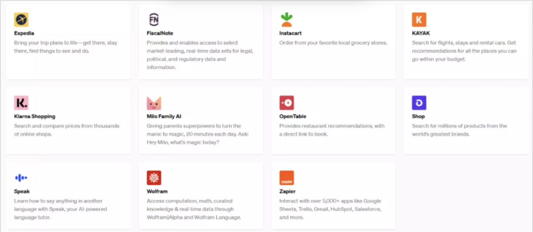 有了插件之后,ChatGPT 开始平台化,而插件就像上面发布的各种 app。