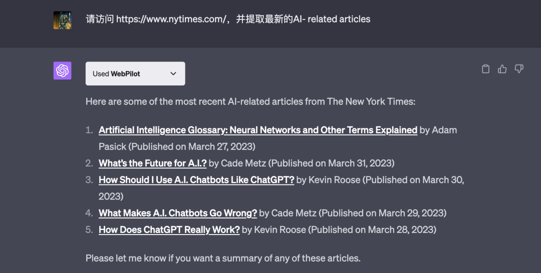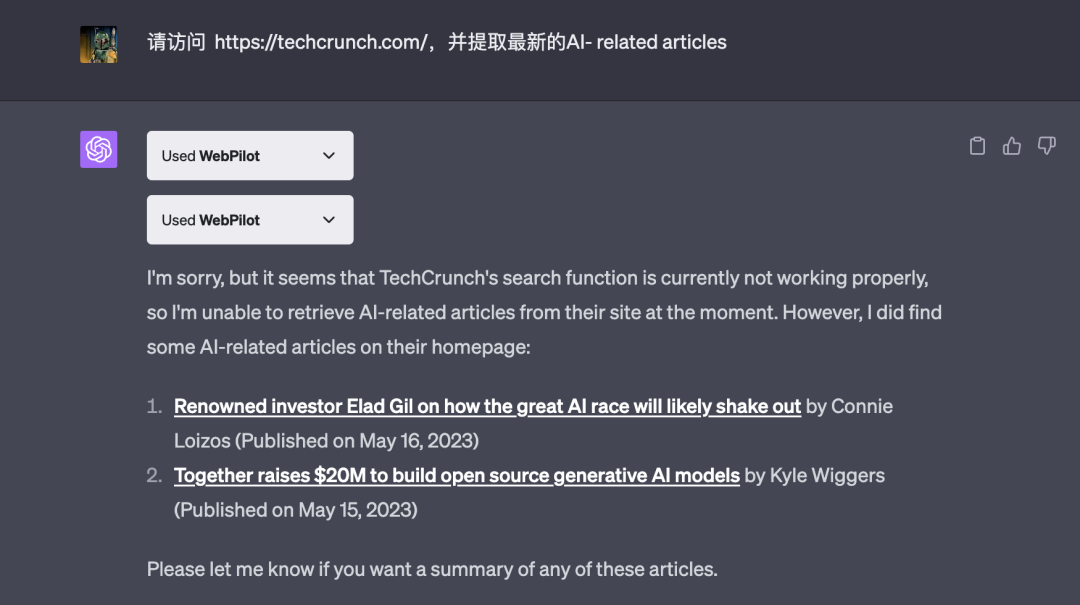 我让 WebPilot 插件“爬” NYT 和 TechCrunch,获取关于 AI 的最新文章。通过 ChatGPT 的回复可以看出,插件运作起来目前并不是十分完善,在 TechCrunch 中只提取到了主页(而非全站)中AI相关的文章。