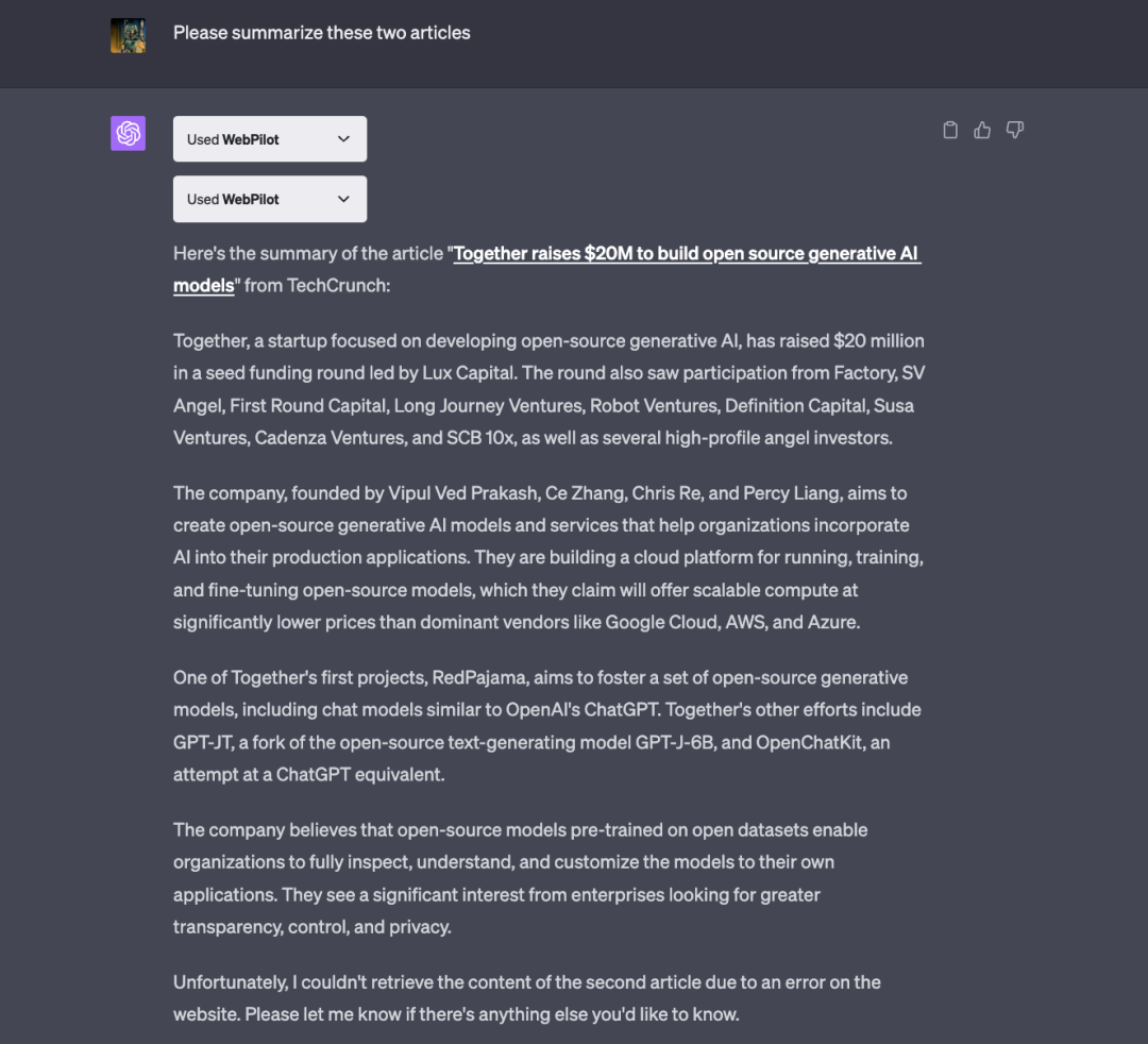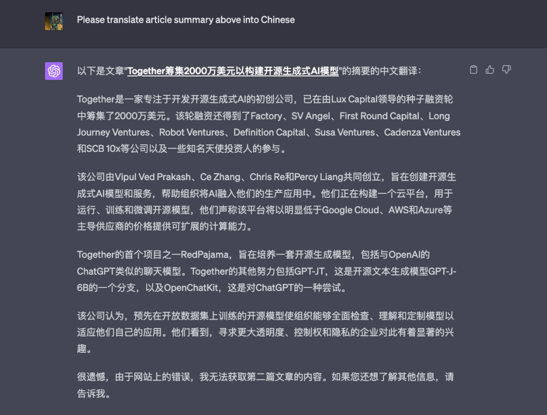 ChatGPT 成功帮我总结了 TechCrunch 其中一篇文章的大概内容。