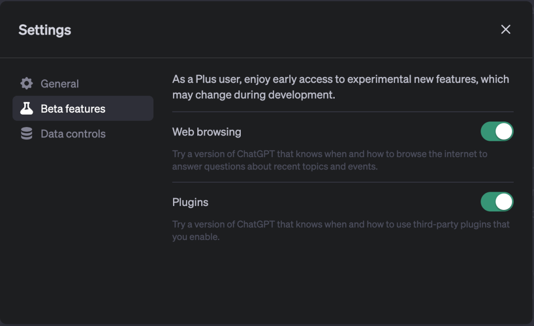 如果你购买了 ChatGPT Plus(每个月 20 美元),你需要先进入设定中打开插件功能开关(默认关闭)。