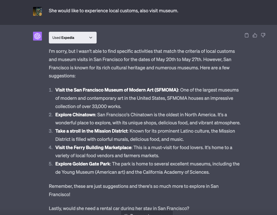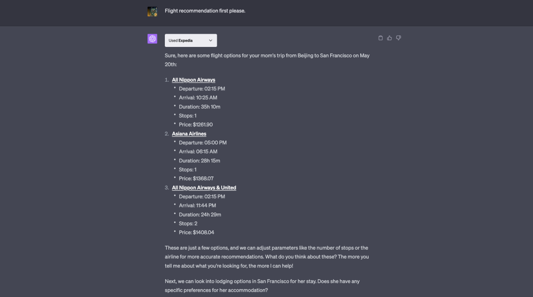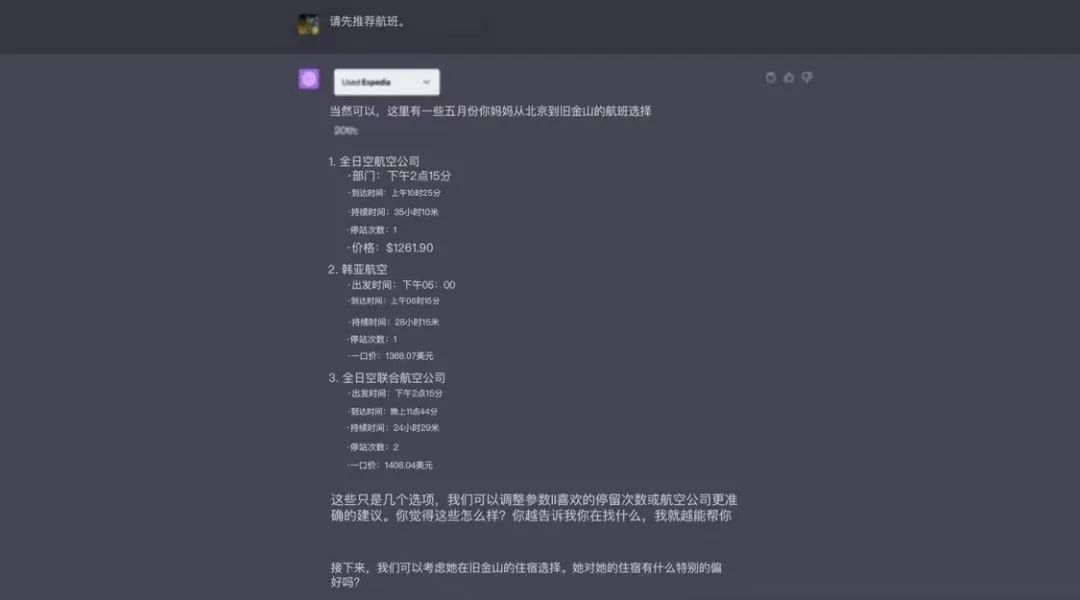 我调用插件 Expedia(国外版携程),被推荐了几班航班。