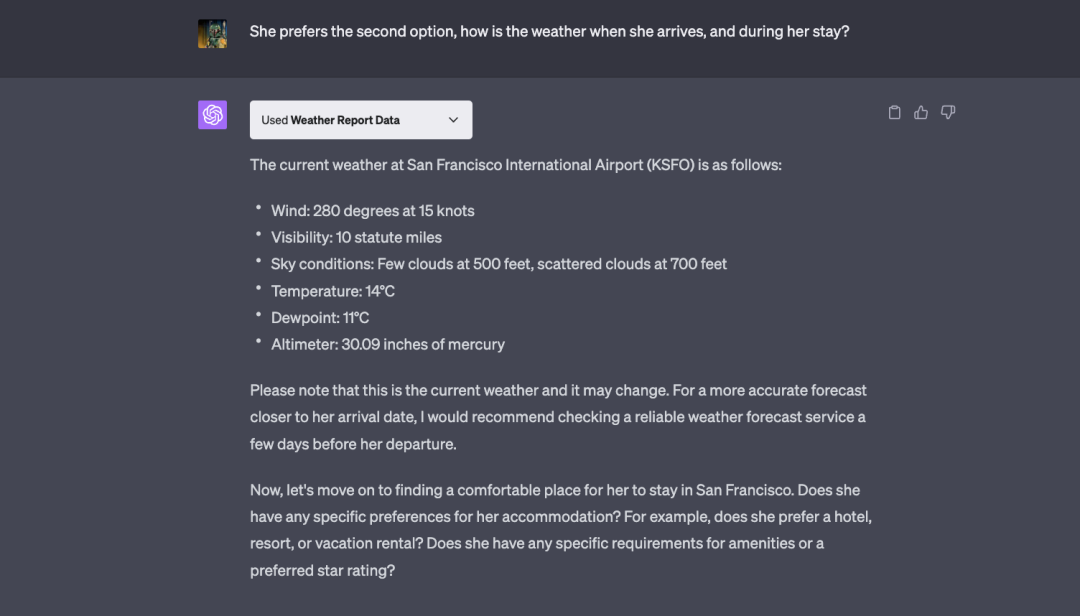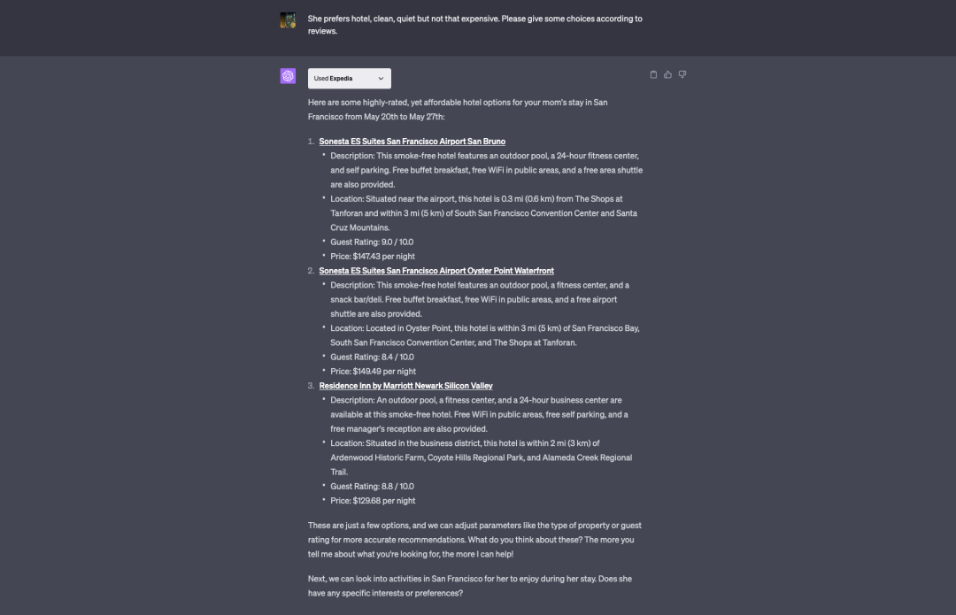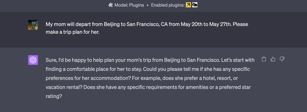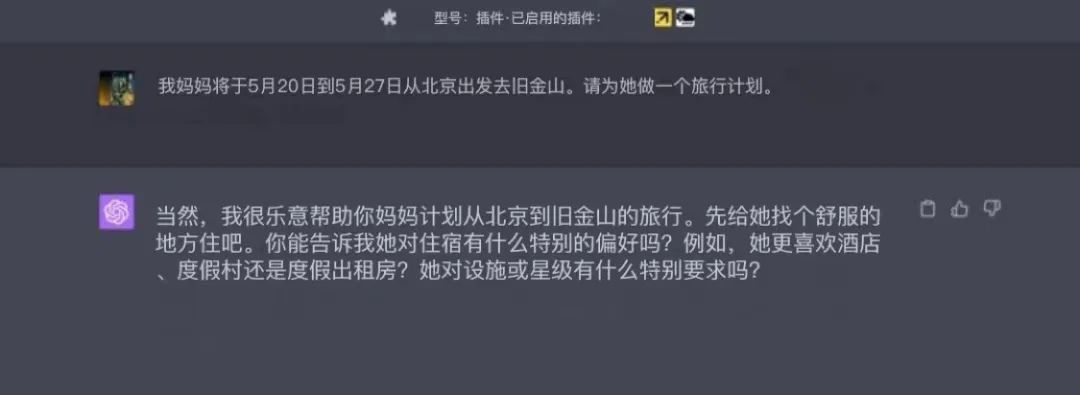 比如现在问 ChatGPT “我带爸爸妈妈去巴黎旅游,应该住几晚?”,模型就会调用酒店预订插件 ,接收 API 响应,并结合 API 数据给你更明确的答案(顺便帮你直接把酒店定了也可以)。