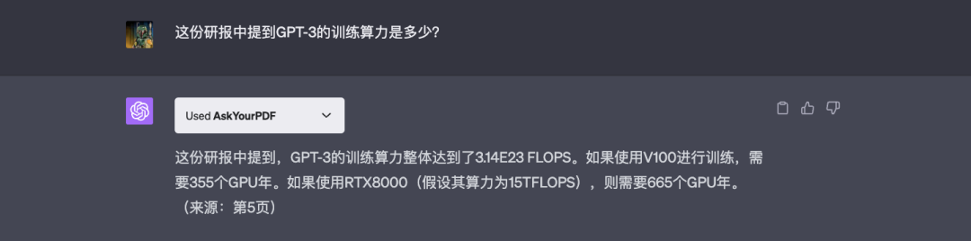 当然你也可以追问它细节。比如根据这份研报,继续追问它,“GPT-3 的训练算力是多少?”它在提供答案的同时,还引用了答案的位置,让你方便核查。