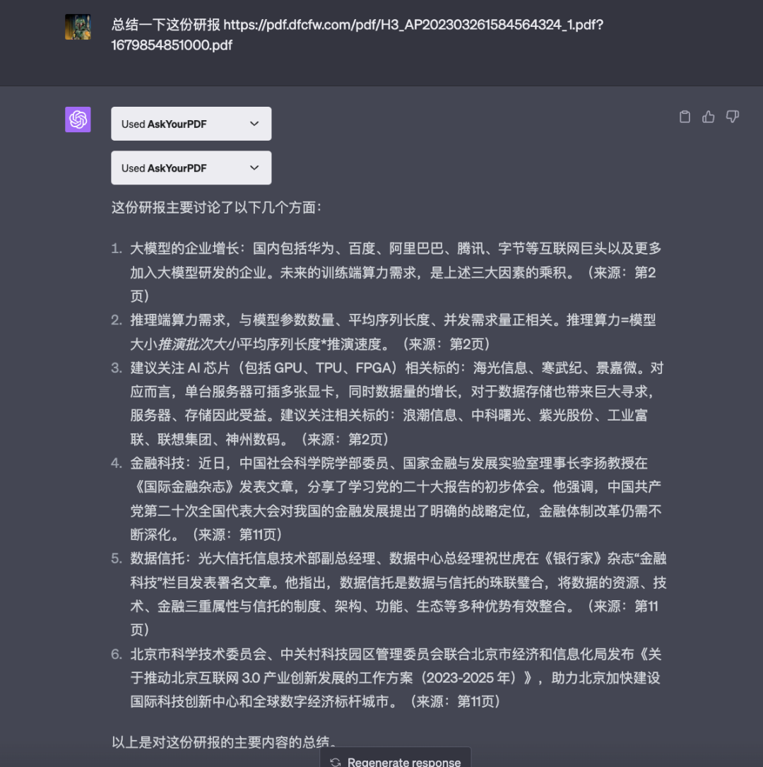 除了信息搜集,还有信息归纳和总结的能力。AskYour PDF 插件,能总结好 PDF 文档的要点给你。