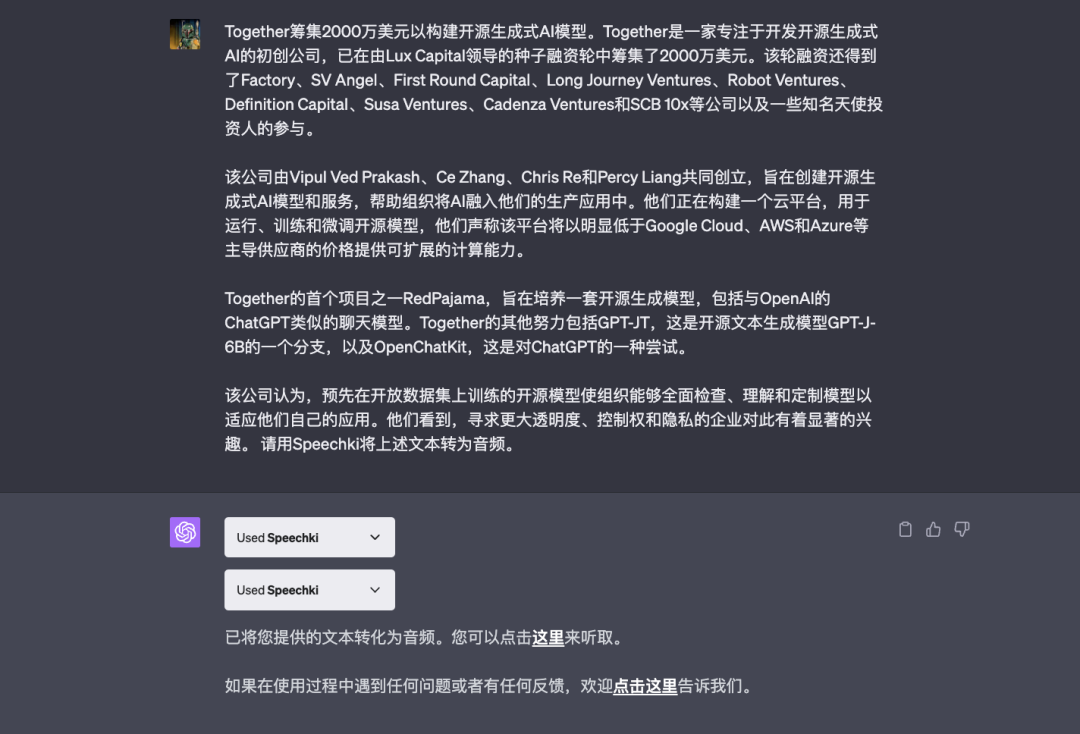 再用另一款插件 Speechki,直接将 ChatGPT 编辑好的文字,转成音频,点击跳转到 Speechki 网站,可以在线听,也可以下载。基于此,一份“AI 资讯”音频就做好了。