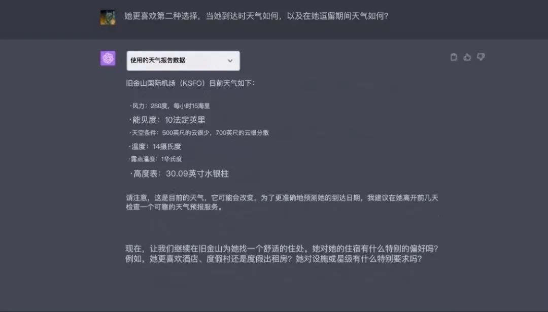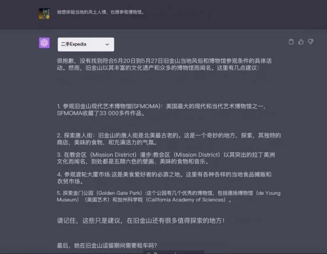 并且提示我,现在住宿也安排完了,是不是得想想逛什么景点,安排点什么活动了?如此“细心”一直到对话结束。