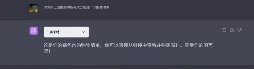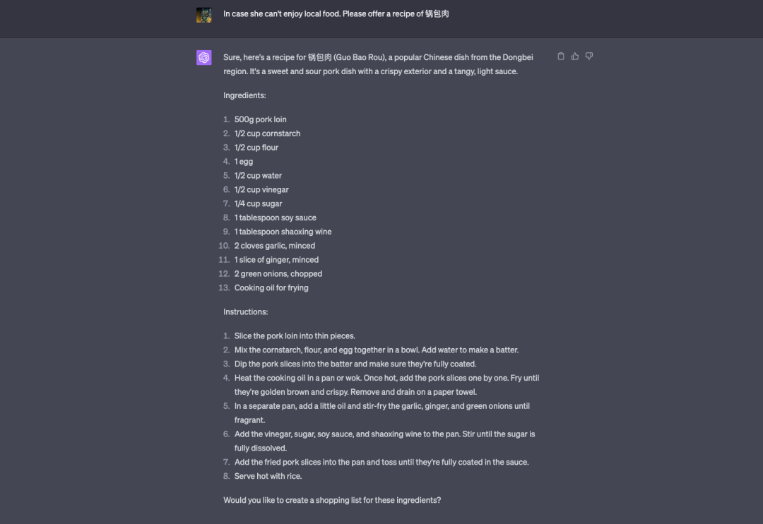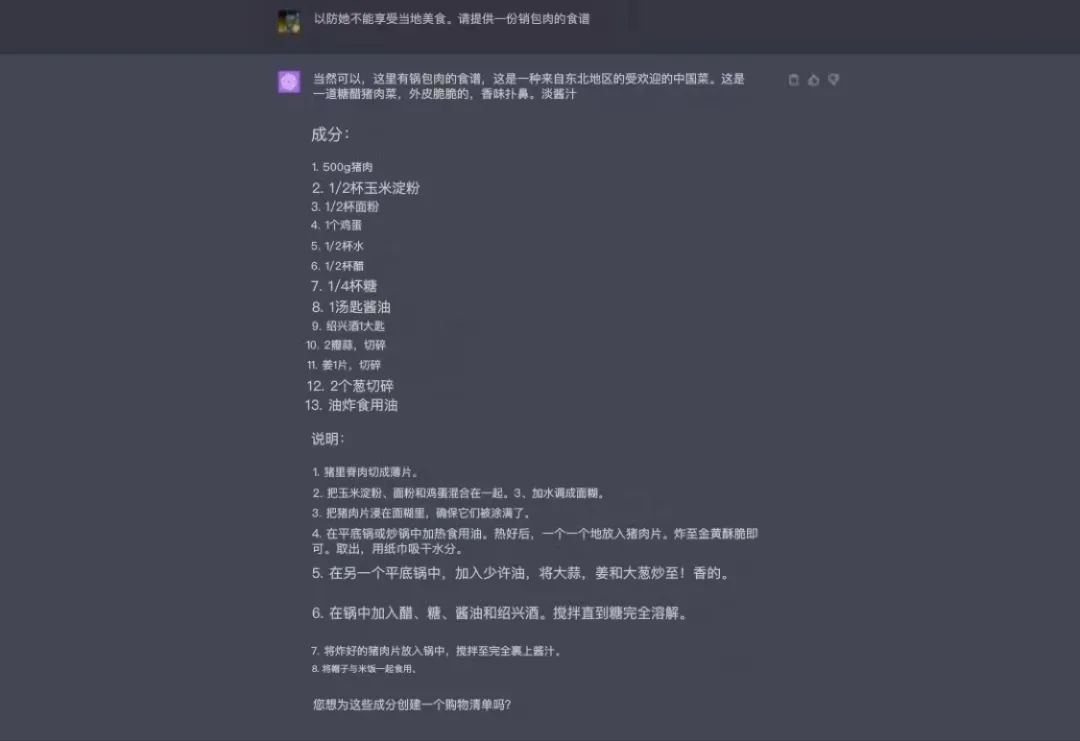 当然我也贴心到考虑,如果我妈不喜欢当地食物,非得自己做饭怎么办?ChatGPT 告诉我,一道常见的东北菜——锅包肉的菜谱。