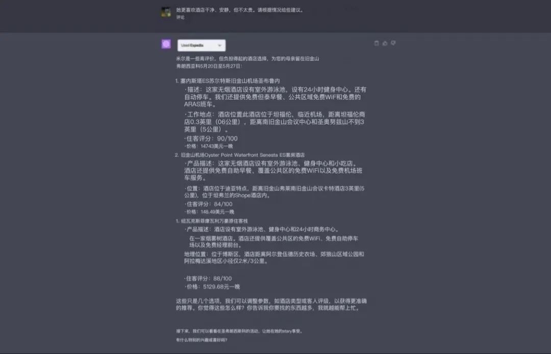 ChatGPT 会根据我的要求提供,“干净、安静、还不贵,评价还得好”的酒店。