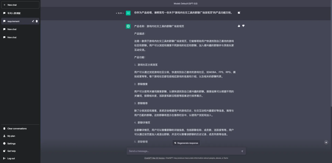 可以看到如果是一句话描述产品功能需求,gpt给出的功能文档虽然覆盖了较多功能,但是内容都比较通用,可能未考虑一些特殊场景